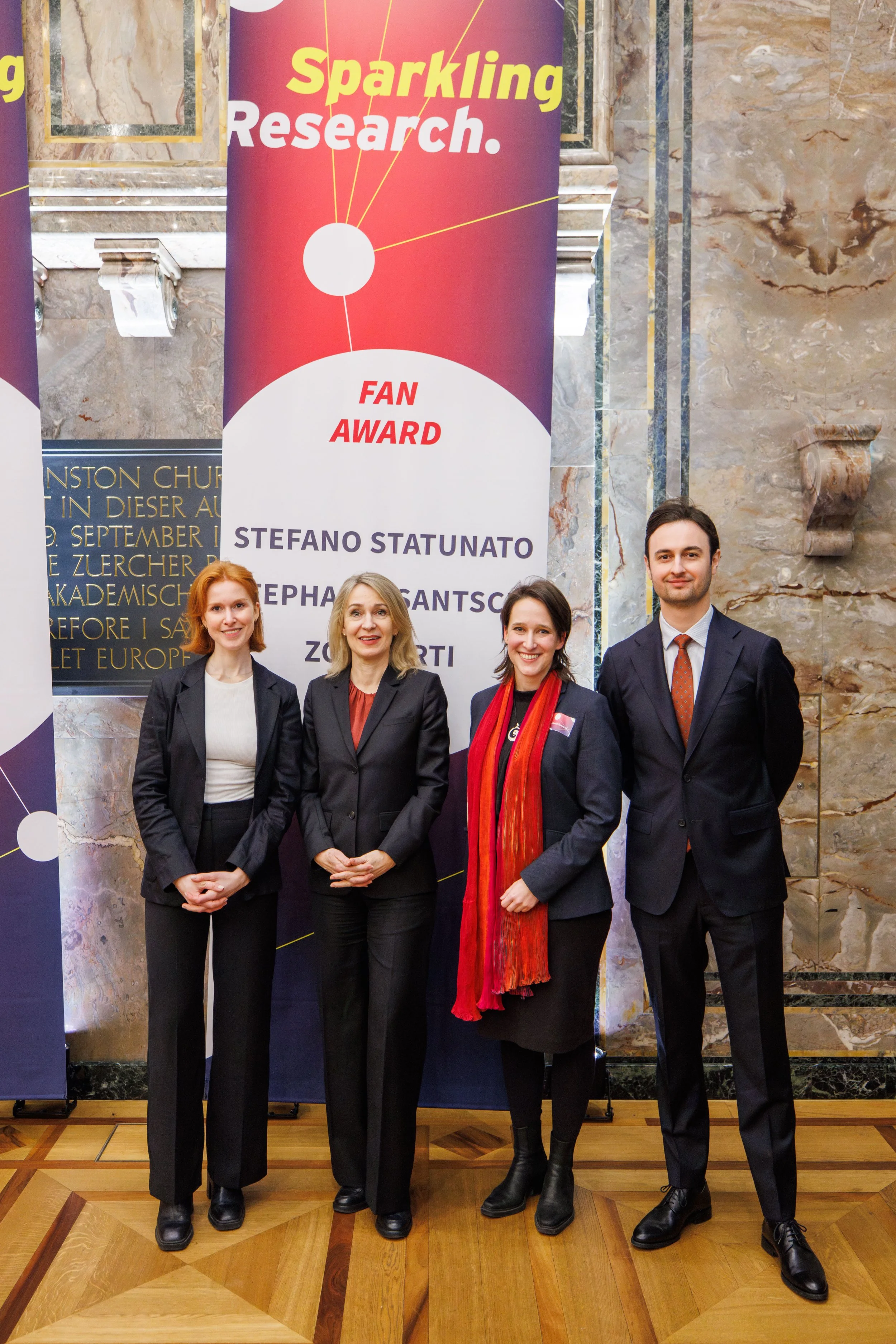 The 2026 FAN Awardees are shown together with Vice President for Research of the University of Zurich, Prof. Elisabeth Stark. Left to right: Zoe Martin (PhD candidate and award of the Faculties of Medicine and Mathematics and Natural Sciences), Prof. Stark, Stephanie Santschi (post-doc; award of the Department of Art History), and Stefano Statunato (Doctoral candidate, award of the Faculty of Law)